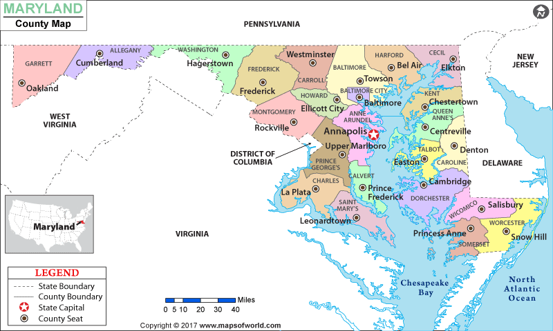 Maryland lies in the Mid-Atlantic region of the United States, sharing its boundaries with Virginia, West Virginia, and Washington, D.C. to its south and west Pennsylvania to its north, and in east with Delaware. Baltimore is the largest city in Maryland, and capital of Maryland is Annapolis. Among all the thirteen colonies, Map of Maryland Counties is considered as a birthplace of religious freedom in America. It is formed by George Calvert in the early 17th century, and considered to be an intended refuge for persecuted Catholics from England.