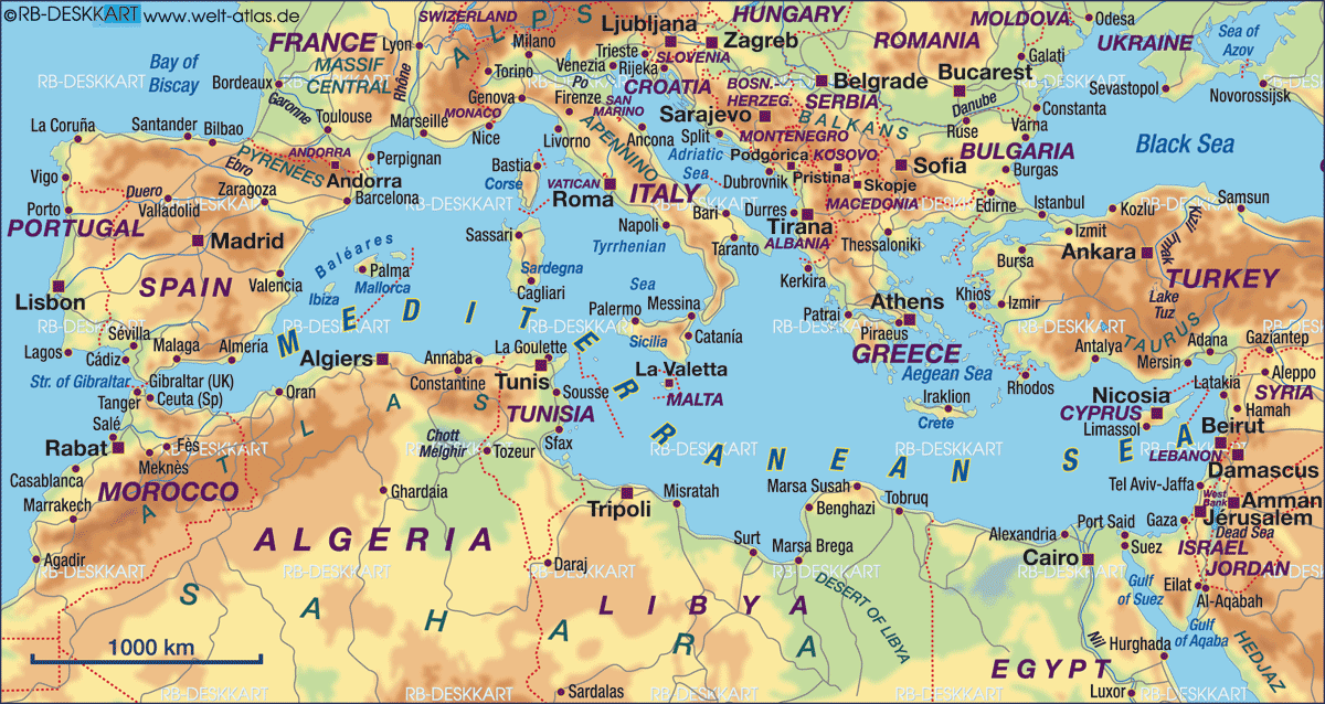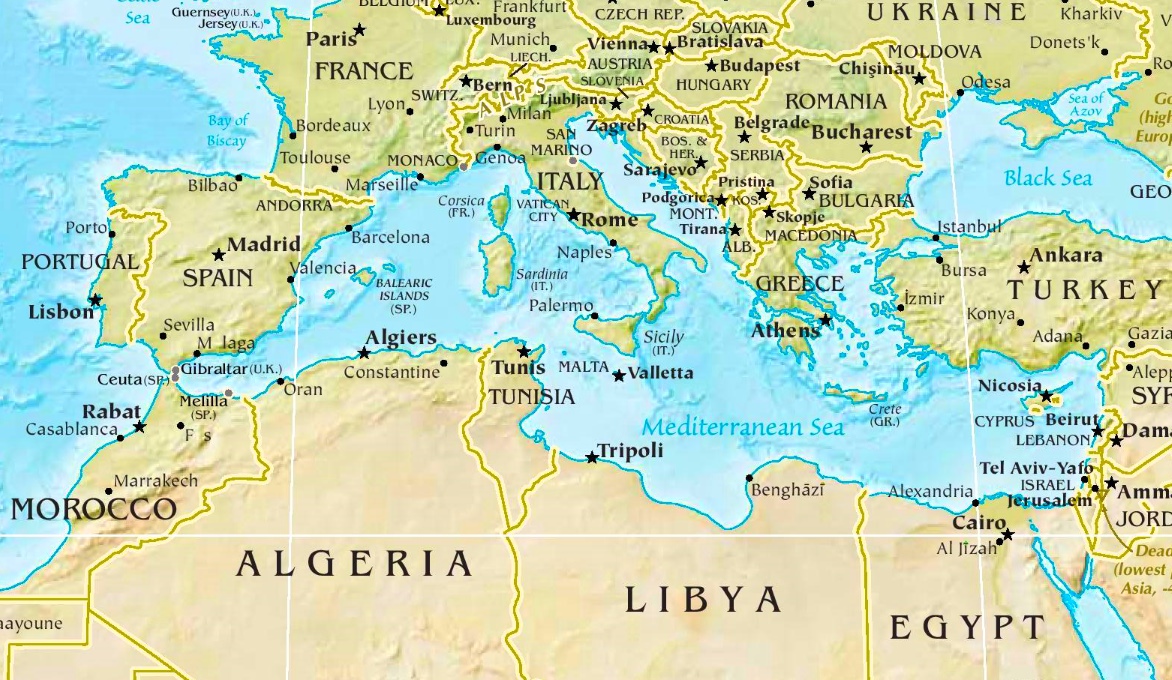 Map of Mediterranean Sea and Surrounding Countries Middle East