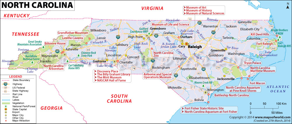 North Carolina is located in the southeastern part of the United States and the neighbor states of North Carolina are Georgia in the south, Virginia in the north, the Atlantic Ocean in east and Tennessee in the west and it share a border with South Carolina. In population, it is ranked 9th in the United States. Map of North Carolinas consists of 100 counties and the capital of North Carolina is Raleigh and most populated municipality is Charlotte and it is also the largest banking center in United State.